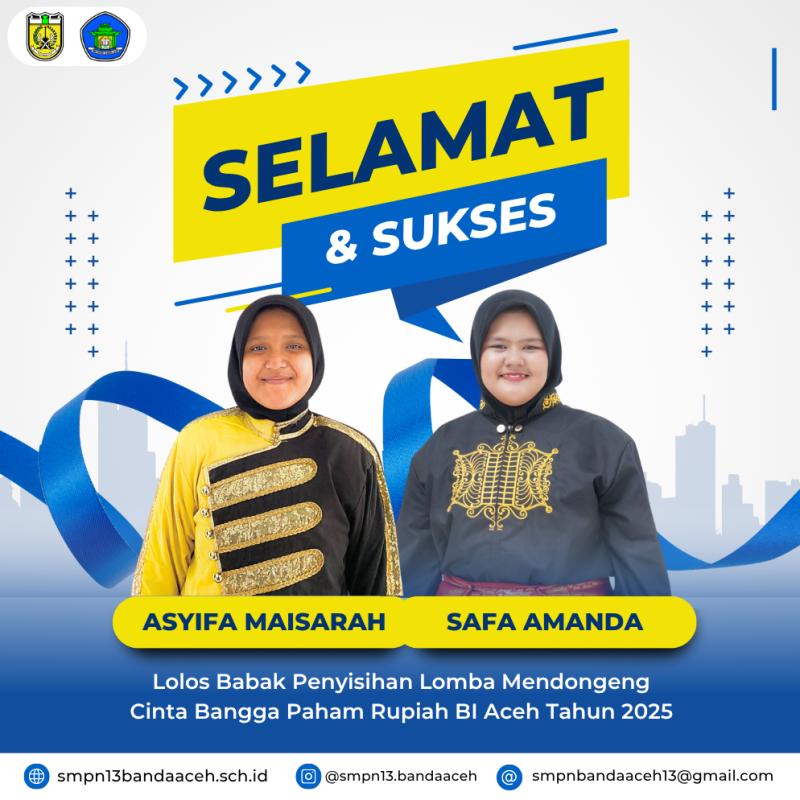 Banda Aceh, 22 Juli 2025 — Prestasi membanggakan kembali ditorehkan oleh dua siswa SMP Negeri 13 Banda Aceh. Asyifa Maisarah dan Safa Amanda, siswa kelas IX, berhasil lolos ke babak penyisihan awal lomba mendongeng “Cinta, Bangga, Paham Rupiah” yang diselenggarakan oleh Kantor Perwakilan Bank Indonesia Aceh. Kompetisi ini bertujuan menanamkan nilai-nilai kecintaan dan kebanggaan terhadap mata uang rupiah kepada generasi muda melalui pendekatan kreatif.
